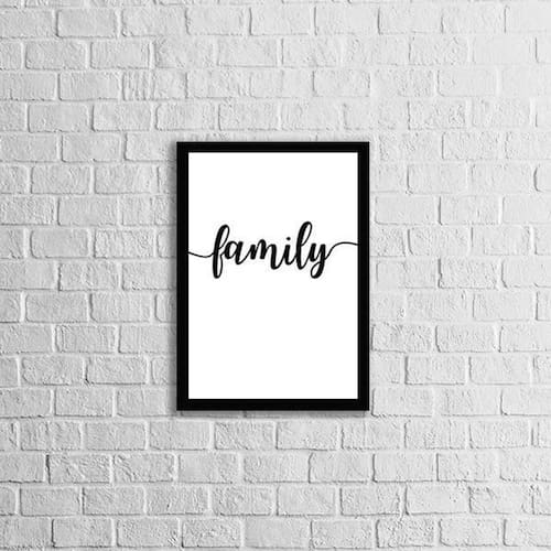 Quadro palavra family 24x18cm Moldura: madeira preta Informações do produto tire todas as suas dúvidas no descritivo abaixo: decoração para quarto, sala, cozinha, escritório, área gourmet e muito mais. Chega de paredes vazias medidas - cada peça tem 24x18cm a5 . Material do papel - papel fotográfico brilhante de altíssima resolução acabamento - todos os quadros são acompanhados de uma película de acetato para proteção da imagem. - moldura em madeira maciça na cor branca e pendurador móvel que pode ser retirado facilmente caso deseje fixar com fita dupla face. - os quadros são embalados de forma segura com plástico bolha com camada dupla de acordo com o tamanho dos quadros. - de 3 meses prazo de envio pedimos 24 horas úteis no máximo para enviar seu pedido após o envio, segue os prazos normais dos correios, cerca de 7 exceto para norte e nordeste, que pode ser de até 14 . Em diversas cidades, este prazo normalmente é reduzido, mas depende do prazo dos correios. Meu quadro chegou. Como posso fixá-lo Você precisa apenas de um martelo e um prego, pois os quadros já vão acompanhados de penduradores. Esta é a forma mais indicada. Caso prefira, você pode utilizar uma fita dupla face neste caso, sugerimos de alta qualidade para evitar que descole e seu quadro caia . Como posso limpar meu quadro A limpeza é feita como um móvel comum da sua casa. Apenas um pano seco ou espanador são suficientes para tal Marca: Não Informado