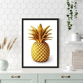 Quadro para cozinha abacaxi dourado 24x18cm - com vidro Cor: moldura preta Informações do produto tire todas as suas dúvidas no descritivo abaixo: decoração para quarto, sala, cozinha, escritório, área gourmet e muito mais. Chega de paredes vazias medidas - cada peça tem 24x18cm a5 . Material do papel - papel fotográfico brilhante de altíssima resolução acabamento - todos os quadros são acompanhados de vidro para proteção da imagem. - moldura em madeira maciça na cor preta ou branca conforme produto escolhido e pendurador . - os quadros são embalados de forma segura com plástico bolha com camada dupla de acordo com o tamanho dos quadros. Garantia - garantia de 3 meses. Meu quadro chegou. Como posso fixá-lo Você precisa apenas de um martelo e um prego, pois os quadros já vão acompanhados de penduradores. Esta é a forma mais indicada. Como posso limpar meu quadro A limpeza é feita como um móvel comum da sua casa. Apenas um pano seco ou espanador são suficientes para tal