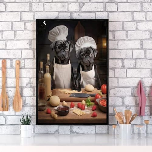 Quadro para cozinha cães raça pug 24x18cm - com vidro Moldura: madeira preta Informações do produto tire todas as suas dúvidas no descritivo abaixo: decoração para quarto, sala, cozinha, escritório, área gourmet e muito mais. Chega de paredes vazias medidas - cada peça tem 24x18cm a5 . Material do papel - papel fotográfico brilhante de altíssima resolução acabamento - todos os quadros são acompanhados de vidro para proteção da imagem. - moldura em madeira maciça na cor preta ou branca conforme produto escolhido e pendurador . - os quadros são embalados de forma segura com plástico bolha com camada dupla de acordo com o tamanho dos quadros. Garantia - garantia de 3 meses. Meu quadro chegou. Como posso fixá-lo Você precisa apenas de um martelo e um prego, pois os quadros já vão acompanhados de penduradores. Esta é a forma mais indicada. Como posso limpar meu quadro A limpeza é feita como um móvel comum da sua casa. Apenas um pano seco ou espanador são suficientes para tal