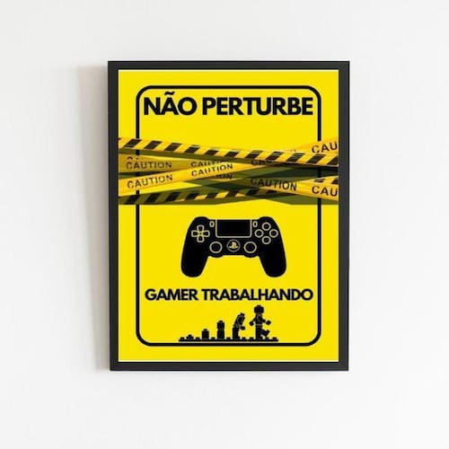 Quadro para porta gamer trabalhando 33x24cm Moldura: madeira preta Informações do produto tire todas as suas dúvidas no descritivo abaixo: decoração para quarto, sala, cozinha, escritório, área gourmet e muito mais. Chega de paredes vazias medidas - cada peça tem 33x24cm a4 . Material do papel - papel fotográfico brilhante de altíssima resolução acabamento - todos os quadros são acompanhados de uma película de acetato para proteção da imagem. - moldura em madeira maciça na cor preta e pendurador móvel que pode ser retirado facilmente caso deseje fixar com fita dupla face. - os quadros são embalados de forma segura com plástico bolha com camada dupla de acordo com o tamanho dos quadros. Garantia - garantia de 3 meses. Meu quadro chegou. Como posso fixá-lo Você precisa apenas de um martelo e um prego, pois os quadros já vão acompanhados de penduradores. Esta é a forma mais indicada. Caso prefira, você pode utilizar uma fita dupla face neste caso, sugerimos de alta qualidade para evitar que descole e seu quadro caia . Como posso limpar meu quadro A limpeza é feita como um móvel comum da sua casa. Apenas um pano seco ou espanador são suficientes para tal