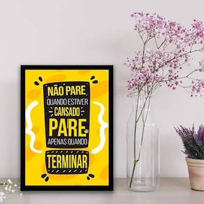 Quadro Pare Apenas Quando Terminar 24X18Cm Moldura: madeira branca Informações do produto Decoração para quarto, sala, cozinha, escritório, área gourmet e muito mais. Chega de paredes vazias. Medidas - cada peça tem 24x18cm a5 . Material do papel - papel fotográfico brilhante de altíssima resolução Acabamento - todos os quadros são acompanhados de uma película de acetato para proteção da imagem. - moldura em madeira maciça na cor branca e pendurador móvel que pode ser retirado facilmente caso deseje fixar com fita dupla face. - os quadros são embalados de forma segura com plástico bolha com camada dupla de acordo com o tamanho dos quadros. - de 3 meses Meu quadro chegou. Como posso fixá-lo: Você precisa apenas de um martelo e um prego, pois os quadros já vão acompanhados de penduradores. Esta é a forma mais indicada. Caso prefira, você pode utilizar uma fita dupla face neste caso, sugerimos de alta qualidade para evitar que descole e seu quadro caia . Como posso limpar meu quadro: A limpeza é feita como um móvel comum da sua casa. Apenas um pano seco ou espanador são suficientes para tal Marca: Não Informado Ean: 7892091057253