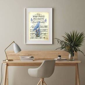 Quadro Passarinho Vintage Azul - 60x48cm - Moldura: Madeira branca