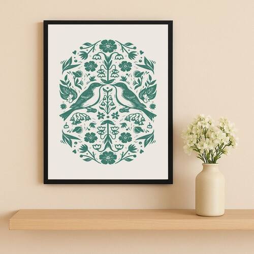 Quadro Passarinhos Folk Art Verde 24x18cm Mold Preta Vidro