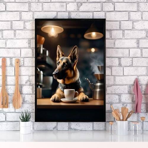 Quadro pastor alemão tomando café 24x18cm - com vidro Moldura: madeira branca Informações do produto tire todas as suas dúvidas no descritivo abaixo: decoração para quarto, sala, cozinha, escritório, área gourmet e muito mais. Chega de paredes vazias medidas - cada peça tem 24x18cm a5 . Material do papel - papel fotográfico brilhante de altíssima resolução acabamento - todos os quadros são acompanhados de vidro para proteção da imagem. - moldura em madeira maciça na cor preta ou branca conforme produto escolhido e pendurador . - os quadros são embalados de forma segura com plástico bolha com camada dupla de acordo com o tamanho dos quadros. Garantia - garantia de 3 meses. Meu quadro chegou. Como posso fixá-lo Você precisa apenas de um martelo e um prego, pois os quadros já vão acompanhados de penduradores. Esta é a forma mais indicada. Como posso limpar meu quadro A limpeza é feita como um móvel comum da sua casa. Apenas um pano seco ou espanador são suficientes para tal