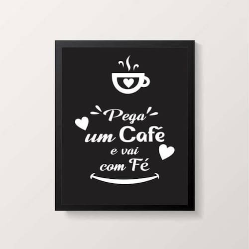 Quadro pega um café e vai na fé 45x34cm - com vidro Moldura: madeira preta Informações do produto tire todas as suas dúvidas no descritivo abaixo: decoração para quarto, sala, cozinha, escritório, área gourmet e muito mais. Chega de paredes vazias medidas - cada peça tem 45x34cm a3 . Material do papel - papel fotográfico brilhante de altíssima resolução acabamento - todos os quadros são acompanhados de vidro para proteção da imagem. - moldura em madeira maciça na cor preta e pendurador . - os quadros são embalados de forma segura com plástico bolha com camada dupla de acordo com o tamanho dos quadros. - de 3 meses. Meu quadro chegou. Como posso fixá-lo Você precisa apenas de um martelo e um prego, pois os quadros já vão acompanhados de penduradores. Esta é a forma mais indicada. Como posso limpar meu quadro A limpeza é feita como um móvel comum da sua casa. Apenas um pano seco ou espanador são suficientes para tal Marca: Não Informado