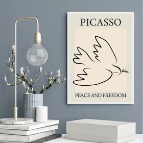 Quadro picasso pomba - peace and freedom 33x24cm - com vidro Moldura: madeira preta Informações do produto tire todas as suas dúvidas no descritivo abaixo: decoração para quarto, sala, cozinha, escritório, área gourmet e muito mais. Chega de paredes vazias medidas - cada peça tem 33x24cm a4 . Material do papel - papel fotográfico brilhante de altíssima resolução acabamento - todos os quadros são acompanhados de vidro para proteção da imagem. - moldura em madeira maciça na cor preta ou branca conforme produto escolhido e pendurador . - os quadros são embalados de forma segura com plástico bolha com camada dupla de acordo com o tamanho dos quadros. Garantia - garantia de 3 meses. Meu quadro chegou. Como posso fixá-lo Você precisa apenas de um martelo e um prego, pois os quadros já vão acompanhados de penduradores. Esta é a forma mais indicada. Como posso limpar meu quadro A limpeza é feita como um móvel comum da sua casa. Apenas um pano seco ou espanador são suficientes para tal