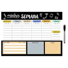 Quadro Planejador de Metal Semanal 29x40cm + Caneta Nossos planejadores são uma ótima opção para você organizar suas tarefas, compromissos, dietas, planos de estudo, definir suas metas, objetivos, entre outros.