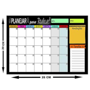O Quadro Planejador de Metal Mensal possui dimensões de 20x26cm, proporcionando espaço suficiente para organizar suas atividades do mês.