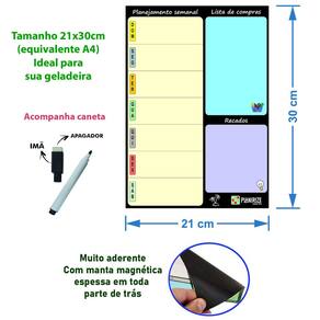- Tamanho 30x21cm (equivalente A4) - Material magnético flexível, adere facilmente a superfícies metálicas como geladeira - Muito resistente e reutilizável, basta escrever e apagar