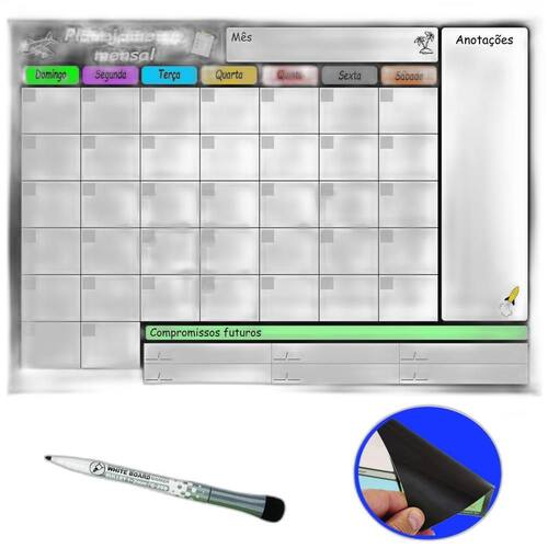 Quadro Planejamento Tarefas Mensal Magnético Imã Geladeira Este quadro magnético para o planejamento de compromissos mensais é uma ferramenta prática e eficaz para manter o controle das atividades e compromissos ao longo do mês. Esse quadro é especialmente útil quando colocado na geladeira, um local de fácil acesso e visibilidade na maioria das casas. Ele ajuda a organizar os compromissos, eventos e tarefas importantes de maneira visual e intuitiva. A parte de trás é totalmente coberta por manta de imã super aderente. Juntamente, é enviada uma caneta preta de ponta fina e com borracha tipo espuma na ponta. Ela também possui um imã em seu corpo, o que permite sua fixação na geladeira. Caso a tinta acabe, esta caneta pode ser facilmente encontrada em qualquer papelaria.
