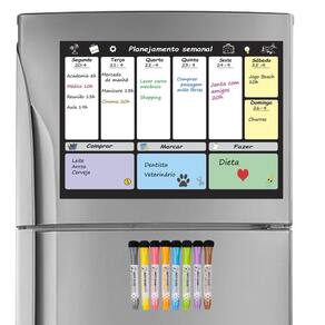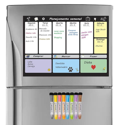 - 1 Quadro magnético de planejamento semanal - 8 Canetas coloridas premium com ponta fina, apagador e imã (fixam diretamente na geladeira)