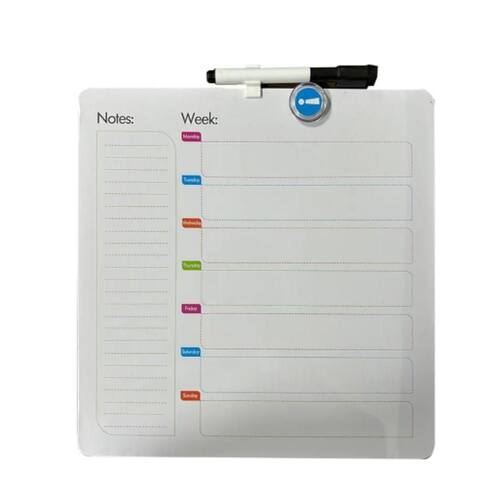 lousa Magnética Semanal – Organização e PraticidadeMantenha sua rotina organizada com a Lousa Magnética Semanal, ideal para planejamento de tarefas, compromissos e anotações importantes. Seu design funcional permite fácil visualização e atualização das informações.Características:Organização Eficiente – Perfeita para planejar sua semana, anotar lembretes, lista de compras ou compromissos.Tamanho Ideal – Dimensões de 29 cm x 29 cm, ideal para diferentes ambientes, como cozinha, escritório ou home office.Material Resistente – Fabricada em plástico e MDF, proporcionando durabilidade e fácil limpeza.Fácil Fixação – Pode ser fixada na parede com fita adesiva ou utilizada em superfícies metálicas devido à sua função magnética.Conteúdo da Embalagem:1 Lousa Magnética Semanal1 Caneta com apagador na tampa2 ÍmãsFita adesiva para fixação na paredeIdeal para quem busca mais praticidade e organização no dia a dia!