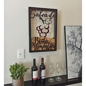 Quadro Porta Rolhas de Vinho - Safra de Bons Momentos 250 Preencha esse lindo quadro com rolhas de vinho ou espumante e tenha uma decoração única na sua casa. Além de ser uma peça indispensável no local onde você desfruta daquele bom vinho este quadro pode ser um excelente presente para surpreender um amigo(a), Namorado(a) e familiares que apreciam um bom vinho e que queiram guardar suas boas lembranças.Nosso produto é EXCLUSIVO pois a escrita em alto relevo sobre o vidro frontal é característica única dentre os outros quadros do mercado, o que destaca ainda mais a beleza deste item. INFORMAÇÕES DO PRODUTO: Marca: Co2Beer Modelo: PR250 Temática do quadro: Vinhos Material frontal: Vidro 2mm. Material do quadro: Madeira e MDF. Dimensões: 38cm da largura x 55cm de comprimento x 5,5cm de profundidade Peso: 3,000gr CARACTERÍSTICAS GERAIS DO PRODUTO: Escrita em auto relevo sob vidro. Pintura automotiva fosca. Acabamento perfeito realizado a laser. Capacidade para aproximadamente 250 rolhas. Abertura superior para inserção das rolhas. Fundo removível para retirada das rolhas. Na embalagem acompanha quadro + vidro frontal 2mm. Obs.: As rolhas não acompanham o produto.