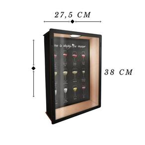Dimensões: Comprimento: 38 cm; Largura: 27,5 cm; Profundidade: 6 cm; Texto ao fundo: wine is always the answer vinho é sempre a resposta ; Imagem: tipos de vinhos; Película transparente em pet, não trinca ou amarela como o acrílico; Produto entregue já montado; Corte à laser - extrema qualidade e acabamento; Fabricado com 100% madeira de reflorestamento; Fixação por parafuso ou fita dupla face estes ítens não acompanham o produto ; Estampa impressa em adesivo de alta resistência; Design moderdo e elegante;