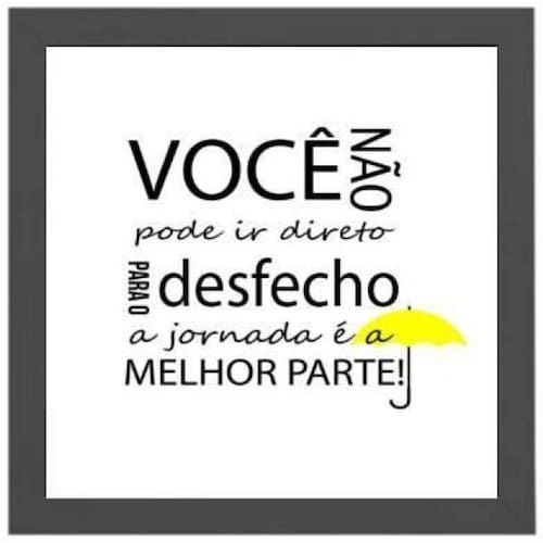 Quadro quadrado a jornada é a melhor parte 20x20cm Moldura: madeira preta Informações do produto tire todas as suas dúvidas no descritivo abaixo: decoração para quarto, sala, cozinha, escritório, área gourmet e muito mais. Chega de paredes vazias medidas - cada peça tem 20x20cm. Material do papel - papel fotográfico brilhante de altíssima resolução acabamento - todos os quadros são acompanhados de uma película de acetato para proteção da imagem. - os quadros são embalados de forma segura com plástico bolha com camada dupla de acordo com o tamanho dos quadros. - de 3 meses. Meu quadro chegou. Como posso fixá-lo Você precisa apenas de um martelo e um prego, pois os quadros já vão acompanhados de penduradores. Esta é a forma mais indicada. Caso prefira, você pode utilizar uma fita dupla face neste caso, sugerimos de alta qualidade para evitar que descole e seu quadro caia . Como posso limpar meu quadro A limpeza é feita como um móvel comum da sua casa. Apenas um pano seco ou espanador são suficientes para tal