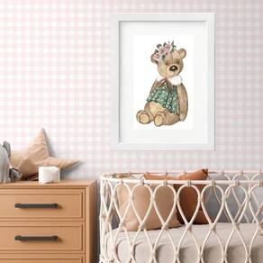 Quadro quarto de bebê ursinha - 60x48cm Moldura: madeira preta Informações do produto tire todas as suas dúvidas no descritivo abaixo: decoração para quarto, sala, cozinha, escritório, área gourmet e muito mais. Chega de paredes vazias medidas - cada peça tem 60x48cm . Material do papel - papel fotográfico brilhante de altíssima resolução acabamento - todos os quadros são acompanhados de vidro para proteção da imagem. - moldura em madeira maciça na cor preta ou branca conforme produto escolhido e pendurador. - paspatur branco com 7cm de largura - os quadros são embalados de forma segura com plástico bolha com camada dupla de acordo com o tamanho dos quadros. Garantia - garantia de 3 meses. Meu quadro chegou. Como posso fixá-lo Você precisa apenas de um martelo e um prego, pois os quadros já vão acompanhados de penduradores. Esta é a forma mais indicada. Como posso limpar meu quadro A limpeza é feita como um móvel comum da sua casa. Apenas um pano seco ou espanador são suficientes para tal