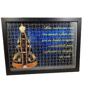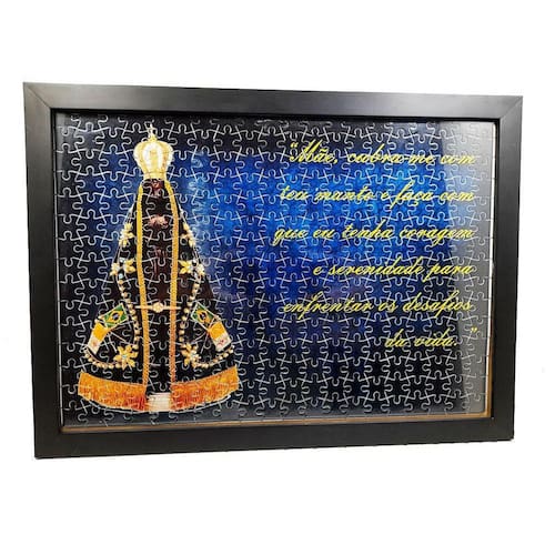 Quadro Decorativo Quebra-Cabeça Nossa Senhora Aparecida de 300 peças + Terço EspecialTodo mundo gosta de dar uma arrumada na casa, deixá-la bem decorada, bonita e agradável renovando os ambientes, deixando o espaço muito bonito e cheio de estilo. Se tem algo que pode sem dúvida fazer a diferença na composição da sua casa é apostar em obras diferentes e únicas na sua decoração. Conheça nossa nova linha de Quadros Decorativos em Quebra-Cabeças personalizados com temas religiosos, neste modelo apresentamos Nossa Senhora de Aparecida de 300 peças, que a ser montado poderá ser colocado na moldura que acompanha o produto. Todos os quebra-cabeças desta linha possuem uma caixa exclusiva e diferenciada onde é colocada a imagem para a orientação da sua montagem, com informações, textos e oração do terço para acompanhar e aprender. Um Terço super especial faz parte deste kit sensacional para suas orações diárias.Acompanha também um moldura no tamanho A3 feita de madeira Imunizada com acabamento laqueado, com vidro 100% cristalino próprio para o segmento de quadro e decorações. Além de tudo isso você nos ajuda a ajudar quem precisa, sem contar que é um presente super diferenciado e especial, quem ganhar com certeza irá se emocionar Características do produto:Peso: 80 grs cadaQuebra-cabeça tamanho: 40 x 29 cmMoldura tamanho: 33 x 45 cmQtde peças: 300 peças