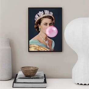 Quadro queen elizabeth with bubblegum 24x18cm - com vidro Cor: moldura preta Informações do produto tire todas as suas dúvidas no descritivo abaixo: decoração para quarto, sala, cozinha, escritório, área gourmet e muito mais. Chega de paredes vazias medidas - cada peça tem 24x18cm a5 . Material do papel - papel fotográfico brilhante de altíssima resolução acabamento - todos os quadros são acompanhados de vidro para proteção da imagem. - moldura em madeira maciça na cor preta ou branca conforme produto escolhido e pendurador . - os quadros são embalados de forma segura com plástico bolha com camada dupla de acordo com o tamanho dos quadros. Garantia - garantia de 3 meses. Meu quadro chegou. Como posso fixá-lo Você precisa apenas de um martelo e um prego, pois os quadros já vão acompanhados de penduradores. Esta é a forma mais indicada. Como posso limpar meu quadro A limpeza é feita como um móvel comum da sua casa. Apenas um pano seco ou espanador são suficientes para tal