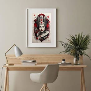 Quadro rainha de copas - 60x48cm Moldura: madeira preta Informações do produto tire todas as suas dúvidas no descritivo abaixo: decoração para quarto, sala, cozinha, escritório, área gourmet e muito mais. Chega de paredes vazias medidas - cada peça tem 60x48cm . Material do papel - papel fotográfico brilhante de altíssima resolução acabamento - todos os quadros são acompanhados de vidro para proteção da imagem. - moldura em madeira maciça na cor preta ou branca conforme produto escolhido e pendurador. - paspatur branco com 7cm de largura - os quadros são embalados de forma segura com plástico bolha com camada dupla de acordo com o tamanho dos quadros. Garantia - garantia de 3 meses. Meu quadro chegou. Como posso fixá-lo Você precisa apenas de um martelo e um prego, pois os quadros já vão acompanhados de penduradores. Esta é a forma mais indicada. Como posso limpar meu quadro A limpeza é feita como um móvel comum da sua casa. Apenas um pano seco ou espanador são suficientes para tal
