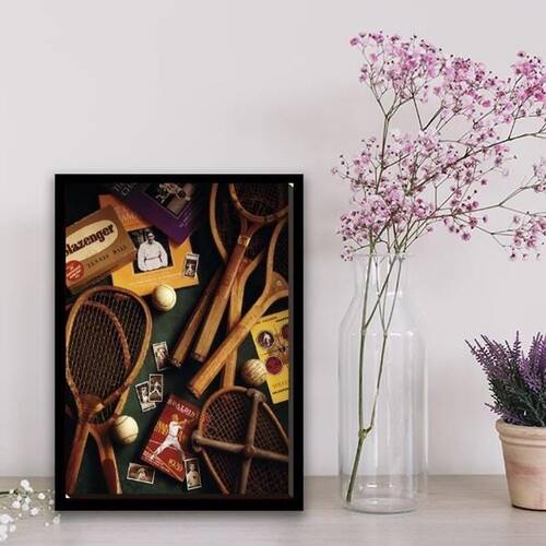 Quadro raquetes tênis vintage 24x18cm - com vidro Moldura: madeira preta Informações do produto tire todas as suas dúvidas no descritivo abaixo: decoração para quarto, sala, cozinha, escritório, área gourmet e muito mais. Chega de paredes vazias medidas - cada peça tem 24x18cm a5 . Material do papel - papel fotográfico brilhante de altíssima resolução acabamento - todos os quadros são acompanhados de vidro para proteção da imagem. - moldura em madeira maciça na cor preta e pendurador . - os quadros são embalados de forma segura com plástico bolha com camada dupla de acordo com o tamanho dos quadros. Garantia - garantia de 3 meses. Meu quadro chegou. Como posso fixá-lo Você precisa apenas de um martelo e um prego, pois os quadros já vão acompanhados de penduradores. Esta é a forma mais indicada. Como posso limpar meu quadro A limpeza é feita como um móvel comum da sua casa. Apenas um pano seco ou espanador são suficientes para tal