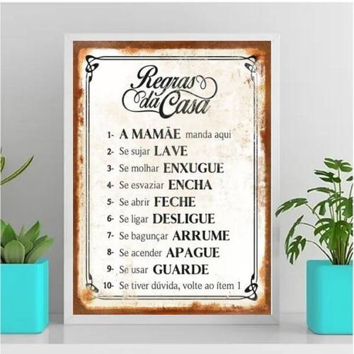 Quadro regras da casa 45x34cm Moldura: madeira branca Informações do produto Decoração para quarto, sala, cozinha, escritório, área gourmet e muito mais. Chega de paredes vazias Medidas - cada peça tem 45x34cm a3 . Material do papel - papel fotográfico brilhante de altíssima resolução Acabamento - todos os quadros são acompanhados de uma película de acetato para proteção da imagem. - os quadros são embalados de forma segura com plástico bolha com camada dupla de acordo com o tamanho dos quadros. - de 3 meses. Meu quadro chegou. Como posso fixá-lo Você precisa apenas de um martelo e um prego, pois os quadros já vão acompanhados de penduradores. Esta é a forma mais indicada. Caso prefira, você pode utilizar uma fita dupla face neste caso, sugerimos de alta qualidade para evitar que descole e seu quadro caia . Como posso limpar meu quadro A limpeza é feita como um móvel comum da sua casa. Apenas um pano seco ou espanador são suficientes para tal Marca: Não Informado Ean: 7891664096040