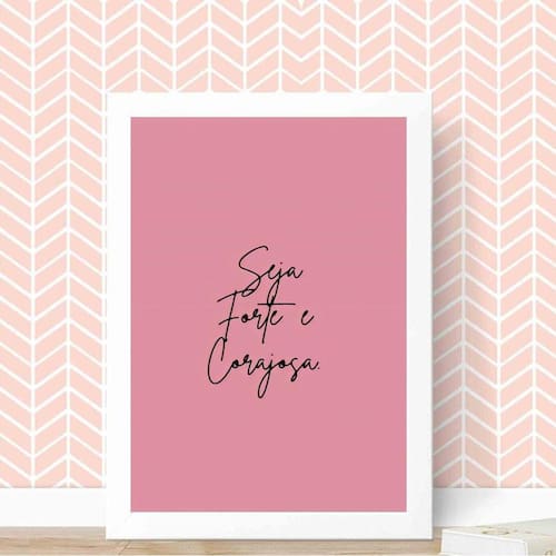 Especificações técnicas: - Título: Quadro Seja Forte E Corajosa- Rosa 24X18Cm - Medidas: 24x18cm A5 - Moldura: Madeira preta - Material do papel: Papel fotográfico brilhante de altíssima resolução - Acabamento: Película de acetato para proteção da imagem - Fixação: Acompanha penduradores para fixação na parede - Limpeza: Utilize um pano seco ou espanador
