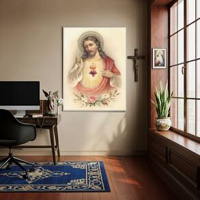 Quadro Sagrado Coração de Jesus Arte Sacra - 70x50cm - Cor: Moldura Branca