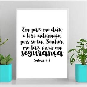 Quadro salmo em paz me deito 45x34cm - com vidro Moldura: madeira preta Informações do produto tire todas as suas dúvidas no descritivo abaixo: decoração para quarto, sala, cozinha, escritório, área gourmet e muito mais. Chega de paredes vazias medidas - cada peça tem 45x34cm a3 . Material do papel - papel fotográfico brilhante de altíssima resolução acabamento - todos os quadros são acompanhados de vidro para proteção da imagem. - moldura em madeira maciça na cor preta e pendurador . - os quadros são embalados de forma segura com plástico bolha com camada dupla de acordo com o tamanho dos quadros. Garantia - garantia de 3 meses. Meu quadro chegou. Como posso fixá-lo Você precisa apenas de um martelo e um prego, pois os quadros já vão acompanhados de penduradores. Esta é a forma mais indicada. Como posso limpar meu quadro A limpeza é feita como um móvel comum da sua casa. Apenas um pano seco ou espanador são suficientes para tal Ean: 7899865153005