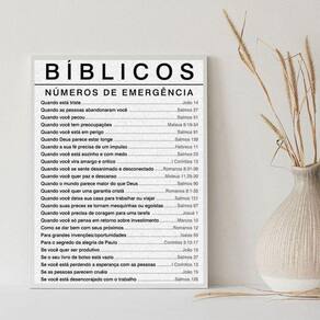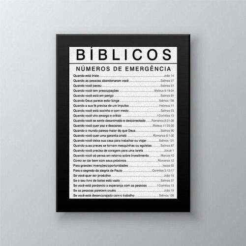Quadro salmos bíblicos números de emergência 24x18cm - com vidro Moldura: madeira preta Informações do produto tire todas as suas dúvidas no descritivo abaixo: decoração para quarto, sala, cozinha, escritório, área gourmet e muito mais. Chega de paredes vazias medidas - cada peça tem 24x18cm a5 . Material do papel - papel fotográfico brilhante de altíssima resolução acabamento - todos os quadros são acompanhados de vidro para proteção da imagem. - moldura em madeira maciça na cor preta e pendurador . - os quadros são embalados de forma segura com plástico bolha com camada dupla de acordo com o tamanho dos quadros. Garantia - garantia de 3 meses. Meu quadro chegou. Como posso fixá-lo Você precisa apenas de um martelo e um prego, pois os quadros já vão acompanhados de penduradores. Esta é a forma mais indicada. Como posso limpar meu quadro A limpeza é feita como um móvel comum da sua casa. Apenas um pano seco ou espanador são suficientes para tal Ean: 7899134920079