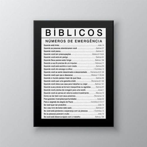 Quadro salmos bíblicos números de emergência 33x24cm - com vidro Moldura: madeira preta Informações do produto tire todas as suas dúvidas no descritivo abaixo: decoração para quarto, sala, cozinha, escritório, área gourmet e muito mais. Chega de paredes vazias medidas - cada peça tem 33x24cm a4 . Material do papel - papel fotográfico brilhante de altíssima resolução acabamento - todos os quadros são acompanhados de vidro para proteção da imagem. - moldura em madeira maciça na cor preta e pendurador . - os quadros são embalados de forma segura com plástico bolha com camada dupla de acordo com o tamanho dos quadros. Garantia - garantia de 3 meses. Meu quadro chegou. Como posso fixá-lo Você precisa apenas de um martelo e um prego, pois os quadros já vão acompanhados de penduradores. Esta é a forma mais indicada. Como posso limpar meu quadro A limpeza é feita como um móvel comum da sua casa. Apenas um pano seco ou espanador são suficientes para tal Ean: 7892369612733