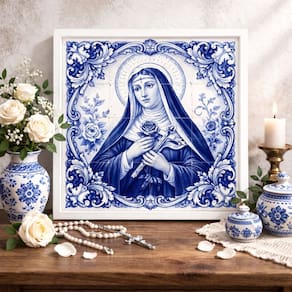 Quadro Santa Rita Cássia Tema Azulejo 33x33 MoldPreta Vidro