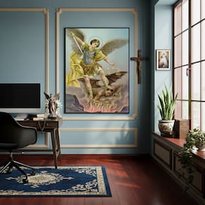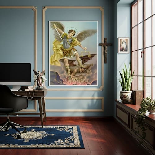 Quadro São Miguel Arcanjo Defensor do Bem - 70x50cm - Cor: Moldura Branca