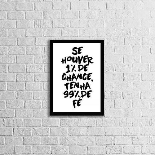 Quadro Se Houver 1% De Chance, Tenha 99% De Fé 24X18Cm Moldura: madeira branca Informações do produto Decoração para quarto, sala, cozinha, escritório, área gourmet e muito mais. Chega de paredes vazias. Medidas - cada peça tem 24x18cm a5 . Material do papel - papel fotográfico brilhante de altíssima resolução Acabamento - todos os quadros são acompanhados de uma película de acetato para proteção da imagem. - moldura em madeira maciça na cor branca e pendurador móvel que pode ser retirado facilmente caso deseje fixar com fita dupla face. - os quadros são embalados de forma segura com plástico bolha com camada dupla de acordo com o tamanho dos quadros. - de 3 meses Meu quadro chegou. Como posso fixá-lo: Você precisa apenas de um martelo e um prego, pois os quadros já vão acompanhados de penduradores. Esta é a forma mais indicada. Caso prefira, você pode utilizar uma fita dupla face neste caso, sugerimos de alta qualidade para evitar que descole e seu quadro caia . Como posso limpar meu quadro: A limpeza é feita como um móvel comum da sua casa. Apenas um pano seco ou espanador são suficientes para tal Marca: Não Informado Ean: 7892091054917