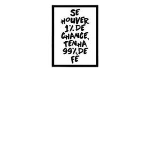 Quadro se houver 1% de chance, tenha 99% de fé 24x18cm Moldura: madeira preta Informações do produto tire todas as suas dúvidas no descritivo abaixo: decoração para quarto, sala, cozinha, escritório, área gourmet e muito mais. Chega de paredes vazias medidas - cada peça tem 24x18cm a5 . Material do papel - papel fotográfico brilhante de altíssima resolução acabamento - todos os quadros são acompanhados de uma película de acetato para proteção da imagem. - moldura em madeira maciça na cor branca e pendurador móvel que pode ser retirado facilmente caso deseje fixar com fita dupla face. - os quadros são embalados de forma segura com plástico bolha com camada dupla de acordo com o tamanho dos quadros. - de 3 meses prazo de envio pedimos 24 horas úteis no máximo para enviar seu pedido após o envio, segue os prazos normais dos correios, cerca de 7 exceto para norte e nordeste, que pode ser de até 14 . Em diversas cidades, este prazo normalmente é reduzido, mas depende do prazo dos correios. Meu quadro chegou. Como posso fixá-lo Você precisa apenas de um martelo e um prego, pois os quadros já vão acompanhados de penduradores. Esta é a forma mais indicada. Caso prefira, você pode utilizar uma fita dupla face neste caso, sugerimos de alta qualidade para evitar que descole e seu quadro caia . Como posso limpar meu quadro A limpeza é feita como um móvel comum da sua casa. Apenas um pano seco ou espanador são suficientes para tal Marca: Não Informado Ean: 7892091054900