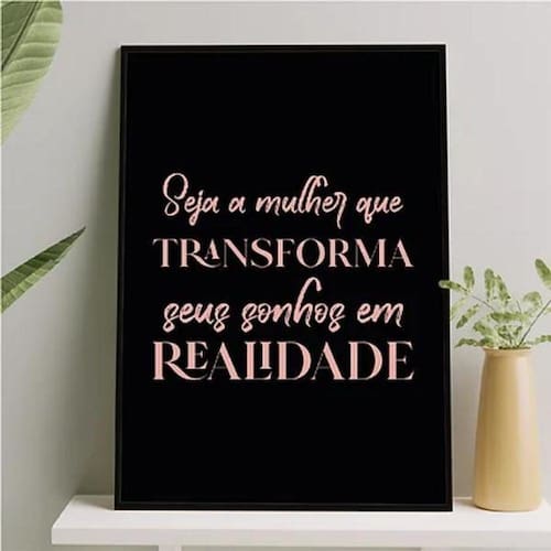 Quadro seja a mulher que transforma sonhos 33x24cm - com vidro Moldura: madeira preta Informações do produtoDecoração para quarto, sala, cozinha, escritório, área gourmet e muito mais. Chega de paredes vazias Medidas - cada peça tem 33x24cm a4 .Material do papel - papel fotográfico brilhante de altíssima resolução Acabamento - todos os quadros são acompanhados de vidro para proteção da imagem. - moldura em madeira maciça e pendurador . - os quadros são embalados de forma segura com plástico bolha com camada dupla de acordo com o tamanho dos quadros. Garantia - garantia de 3 meses. Meu quadro chegou. Como posso fixá-lo Você precisa apenas de um martelo e um prego, pois os quadros já vão acompanhados de penduradores. Esta é a forma mais indicada. Como posso limpar meu quadro A limpeza é feita como um móvel comum da sua casa. Apenas um pano seco ou espanador são suficientes para tal.