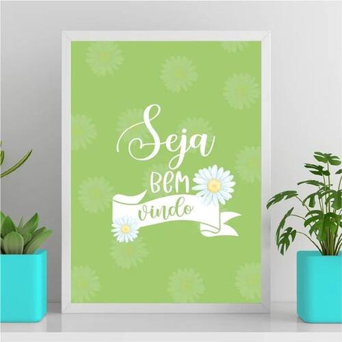 Quadro seja bem vindo - margaridas 24x18cm - com vidro Moldura: madeira branca