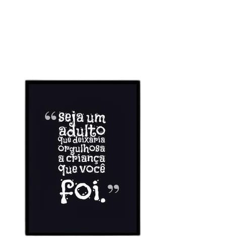 Quadro seja o orgulho de uma criança 45x34cm Moldura: madeira preta Informações do produto Decoração para quarto, sala, cozinha, escritório, área gourmet e muito mais. Chega de paredes vazias. Medidas - cada peça tem 45x34cm a3 . Material do papel - papel fotográfico brilhante de altíssima resolução Acabamento - todos os quadros são acompanhados de uma película de acetato para proteção da imagem. - os quadros são embalados de forma segura com plástico bolha com camada dupla de acordo com o tamanho dos quadros. - de 3 meses. Meu quadro chegou. Como posso fixá-lo Você precisa apenas de um martelo e um prego, pois os quadros já vão acompanhados de penduradores. Esta é a forma mais indicada. Caso prefira, você pode utilizar uma fita dupla face neste caso, sugerimos de alta qualidade para evitar que descole e seu quadro caia . Como posso limpar meu quadro A limpeza é feita como um móvel comum da sua casa. Apenas um pano seco ou espanador são suficientes para tal Marca: Não Informado Ean: 7893168559267