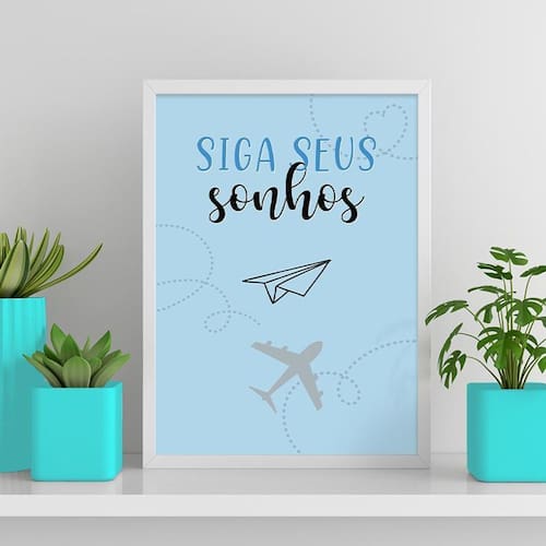 Quadro siga seus sonhos avião azul 24x18cm - com vidro Moldura: madeira branca Informações do produto Decoração para quarto, sala, cozinha, escritório, área gourmet e muito mais. Chega de paredes vazias Medidas - cada peça tem 24x18cm a5 . Material do papel - papel fotográfico brilhante de altíssima resolução Acabamento - todos os quadros são acompanhados de vidro para proteção da imagem. - moldura em madeira maciça e pendurador . - os quadros são embalados de forma segura com plástico bolha com camada dupla de acordo com o tamanho dos quadros. - de 3 meses. Meu quadro chegou. Como posso fixá-lo Você precisa apenas de um martelo e um prego, pois os quadros já vão acompanhados de penduradores. Esta é a forma mais indicada. Caso prefira, você pode utilizar uma fita dupla face neste caso, sugerimos de alta qualidade para evitar que descole e seu quadro caia . Como posso limpar meu quadro A limpeza é feita como um móvel comum da sua casa. Apenas um pano seco ou espanador são suficientes para tal