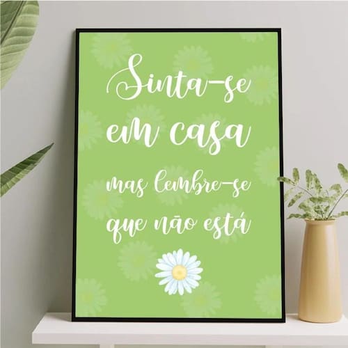 Quadro sinta-se em casa mas lembre-se que não está 45x34cm Moldura: madeira preta Informações do produto decoração para quarto, sala, cozinha, escritório, área gourmet e muito mais. Chega de paredes vazias Medidas - cada peça tem 45x34cm a3 . Material do papel - papel fotográfico brilhante de altíssima resolução Acabamento - todos os quadros são acompanhados de uma película de acetato para proteção da imagem. - os quadros são embalados de forma segura com plástico bolha com camada dupla de acordo com o tamanho dos quadros. - de 3 meses. Meu quadro chegou. Como posso fixá-lo Você precisa apenas de um martelo e um prego, pois os quadros já vão acompanhados de penduradores. Esta é a forma mais indicada. Caso prefira, você pode utilizar uma fita dupla face neste caso, sugerimos de alta qualidade para evitar que descole e seu quadro caia . Como posso limpar meu quadro A limpeza é feita como um móvel comum da sua casa. Apenas um pano seco ou espanador são suficientes para tal Marca: Não Informado Ean: 7896171718843