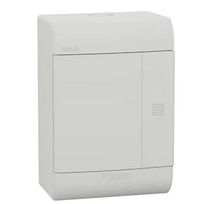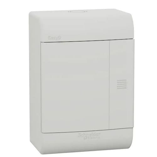 Quadro Sobrepor da marca Schneider, modelo Invólucro da linha Easy9, referência IEC 60670-5. Feito em Plástico autoextinguível na cor branca sendo ela de sobrepor, comporta até 05 módulos de disjuntor DIN e não possui Barramento para disjuntor. Sua tensão de isolamento é de 500V e sua tensão nominal de 400V, IP40 de índice de proteção utilizado em instalações elétricas industriais, comerciais e residenciais para acomodação de disjuntores, Interruptores Diferenciais Residuais (IDR) e Protetores de Surto de corrente. Possibilita a distribuição de circuitos e equilíbrio entre as fases. Sua norma IEC 60670-1,