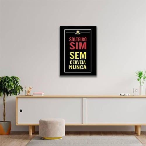 Quadro solteiro sim, sem cerveja nunca 24x18cm - com vidro Moldura: madeira preta Informações do produto Decoração para quarto, sala, cozinha, escritório, área gourmet e muito mais. Chega de paredes vazias Medidas - cada peça tem 24x18cm a5 . Material do papel - papel fotográfico brilhante de altíssima resolução acabamento - todos os quadros são acompanhados de vidro para proteção da imagem. - moldura em madeira maciça na cor preta e pendurador . - os quadros são embalados de forma segura com plástico bolha com camada dupla de acordo com o tamanho dos quadros. - de 3 meses. Meu quadro chegou. Como posso fixá-lo Você precisa apenas de um martelo e um prego, pois os quadros já vão acompanhados de penduradores. Esta é a forma mais indicada. Como posso limpar meu quadro A limpeza é feita como um móvel comum da sua casa. Apenas um pano seco ou espanador são suficientes para tal Marca: Não Informado