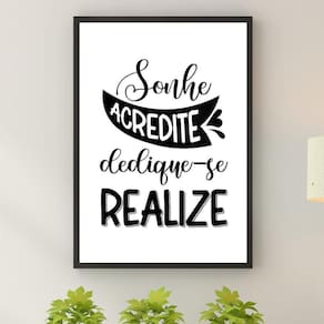 Quadro sonhe acredite dedique-se realize 33x24cm Moldura: madeira branca Informações do produto tire todas as suas dúvidas no descritivo abaixo: decoração para quarto, sala, cozinha, escritório, área gourmet e muito mais. Chega de paredes vazias medidas - cada peça tem 33x24cm a4 . Material do papel - papel fotográfico brilhante de altíssima resolução acabamento - todos os quadros são acompanhados de uma película de acetato para proteção da imagem. - os quadros são embalados de forma segura com plástico bolha com camada dupla de acordo com o tamanho dos quadros. Garantia - garantia de 3 meses. Meu quadro chegou. Como posso fixá-lo Você precisa apenas de um martelo e um prego, pois os quadros já vão acompanhados de penduradores. Esta é a forma mais indicada. Caso prefira, você pode utilizar uma fita dupla face neste caso, sugerimos de alta qualidade para evitar que descole e seu quadro caia . Como posso limpar meu quadro A limpeza é feita como um móvel comum da sua casa. Apenas um pano seco ou espanador são suficientes para tal