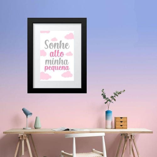 Quadro sonhe alto minha pequena - 60x48cm Moldura: madeira branca Informações do produto tire todas as suas dúvidas no descritivo abaixo: decoração para quarto, sala, cozinha, escritório, área gourmet e muito mais. Chega de paredes vazias medidas - cada peça tem 60x48cm . Material do papel - papel fotográfico brilhante de altíssima resolução acabamento - todos os quadros são acompanhados de vidro para proteção da imagem. - moldura em madeira maciça na cor preta ou branca conforme produto escolhido e pendurador. - paspatur branco com 7cm de largura - os quadros são embalados de forma segura com plástico bolha com camada dupla de acordo com o tamanho dos quadros. Garantia - garantia de 3 meses. Meu quadro chegou. Como posso fixá-lo Você precisa apenas de um martelo e um prego, pois os quadros já vão acompanhados de penduradores. Esta é a forma mais indicada. Como posso limpar meu quadro A limpeza é feita como um móvel comum da sua casa. Apenas um pano seco ou espanador são suficientes para tal
