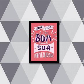 Quadro sua vida e a sua mentalidade 24x18cm Moldura: madeira preta Informações do produto tire todas as suas dúvidas no descritivo abaixo: decoração para quarto, sala, cozinha, escritório, área gourmet e muito mais. Chega de paredes vazias medidas - cada peça tem 24x18cm a5 . Material do papel - papel fotográfico brilhante de altíssima resolução acabamento - todos os quadros são acompanhados de uma película de acetato para proteção da imagem. - moldura em madeira maciça na cor branca e pendurador móvel que pode ser retirado facilmente caso deseje fixar com fita dupla face. - os quadros são embalados de forma segura com plástico bolha com camada dupla de acordo com o tamanho dos quadros. - de 3 meses prazo de envio pedimos 24 horas úteis no máximo para enviar seu pedido após o envio, segue os prazos normais dos correios, cerca de 7 exceto para norte e nordeste, que pode ser de até 14 . Em diversas cidades, este prazo normalmente é reduzido, mas depende do prazo dos correios. Meu quadro chegou. Como posso fixá-lo Você precisa apenas de um martelo e um prego, pois os quadros já vão acompanhados de penduradores. Esta é a forma mais indicada. Caso prefira, você pode utilizar uma fita dupla face neste caso, sugerimos de alta qualidade para evitar que descole e seu quadro caia . Como posso limpar meu quadro A limpeza é feita como um móvel comum da sua casa. Apenas um pano seco ou espanador são suficientes para tal Marca: Não Informado Ean: 7892091053385
