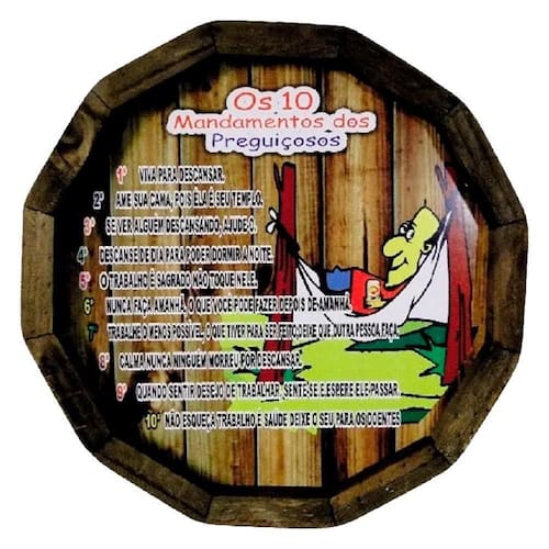 Quadro tampa de barril em madeira rústica - os 10 mandamentos dos preguiçosos Quadro tampa de barril em madeira rústica decorativa