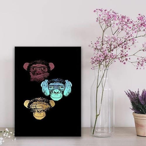 Quadro três macacos sábios 33x24cm - com vidro Moldura: madeira preta Informações do produtoDecoração para quarto, sala, cozinha, escritório, área gourmet e muito mais. Chega de paredes vazias Medidas - cada peça tem 33x24cm a4 . Material do papel - papel fotográfico brilhante de altíssima resolução acabamento - todos os quadros são acompanhados de vidro para proteção da imagem. - moldura em madeira maciça e pendurador . - os quadros são embalados de forma segura com plástico bolha com camada dupla de acordo com o tamanho dos quadros. Garantia - garantia de 3 meses. Meu quadro chegou. Como posso fixá-lo Você precisa apenas de um martelo e um prego, pois os quadros já vão acompanhados de penduradores. Esta é a forma mais indicada. Como posso limpar meu quadro A limpeza é feita como um móvel comum da sua casa. Apenas um pano seco ou espanador são suficientes para tal