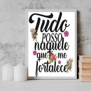 Quadro tudo posso naquele que me fortalece 24x18cm Moldura: madeira branca Informações do produto tire todas as suas dúvidas no descritivo abaixo: decoração para quarto, sala, cozinha, escritório, área gourmet e muito mais. Chega de paredes vazias medidas - cada peça tem 24x18cm a5 . Material do papel - papel fotográfico brilhante de altíssima resolução acabamento - todos os quadros são acompanhados de uma película de acetato para proteção da imagem. - os quadros são embalados de forma segura com plástico bolha com camada dupla de acordo com o tamanho dos quadros. Garantia - garantia de 3 meses. Meu quadro chegou. Como posso fixá-lo Você precisa apenas de um martelo e um prego, pois os quadros já vão acompanhados de penduradores. Esta é a forma mais indicada. Caso prefira, você pode utilizar uma fita dupla face neste caso, sugerimos de alta qualidade para evitar que descole e seu quadro caia . Como posso limpar meu quadro A limpeza é feita como um móvel comum da sua casa. Apenas um pano seco ou espanador são suficientes para tal Ean: 7891576049578
