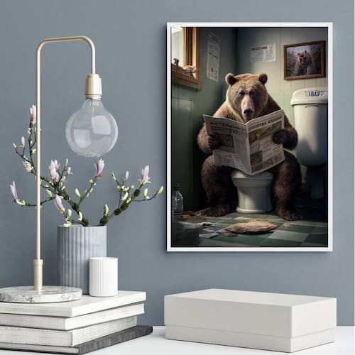 Quadro urso no banheiro lendo jornal 24x18cm Moldura: madeira preta Informações do produto tire todas as suas dúvidas no descritivo abaixo: decoração para quarto, sala, cozinha, escritório, área gourmet e muito mais. Chega de paredes vazias medidas - cada peça tem 24x18cm a5 . Material do papel - papel fotográfico brilhante de altíssima resolução acabamento - todos os quadros são acompanhados de uma película de acetato para proteção da imagem. - os quadros são embalados de forma segura com plástico bolha com camada dupla de acordo com o tamanho dos quadros. Garantia - garantia de 3 meses. Meu quadro chegou. Como posso fixá-lo Você precisa apenas de um martelo e um prego, pois os quadros já vão acompanhados de penduradores. Esta é a forma mais indicada. Caso prefira, você pode utilizar uma fita dupla face neste caso, sugerimos de alta qualidade para evitar que descole e seu quadro caia . Como posso limpar meu quadro A limpeza é feita como um móvel comum da sua casa. Apenas um pano seco ou espanador são suficientes para tal