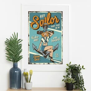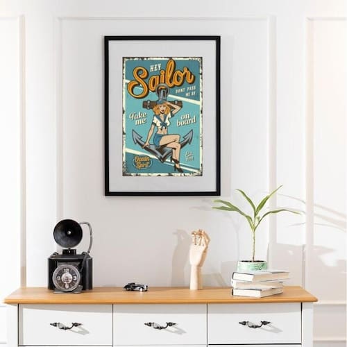 Quadro vintage marinheira - 60x48cm Cor: moldura branca Informações do produto tire todas as suas dúvidas no descritivo abaixo: decoração para quarto, sala, cozinha, escritório, área gourmet e muito mais. Chega de paredes vazias medidas - cada peça tem 60x48cm . Material do papel - papel fotográfico brilhante de altíssima resolução acabamento - todos os quadros são acompanhados de vidro para proteção da imagem. - moldura em madeira maciça na cor preta ou branca conforme produto escolhido e pendurador. - paspatur branco com 7cm de largura - os quadros são embalados de forma segura com plástico bolha com camada dupla de acordo com o tamanho dos quadros. Garantia - garantia de 3 meses. Meu quadro chegou. Como posso fixá-lo Você precisa apenas de um martelo e um prego, pois os quadros já vão acompanhados de penduradores. Esta é a forma mais indicada. Como posso limpar meu quadro A limpeza é feita como um móvel comum da sua casa. Apenas um pano seco ou espanador são suficientes para tal