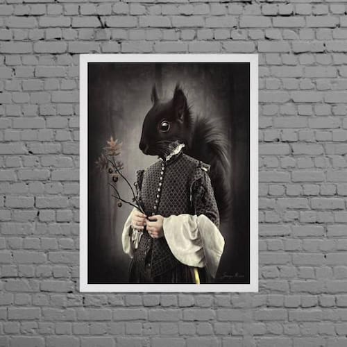 Quadro vintage senhora esquilo 33x24cm Moldura: madeira branca Informações do produto tire todas as suas dúvidas no descritivo abaixo: decoração para quarto, sala, cozinha, escritório, área gourmet e muito mais. Chega de paredes vazias medidas - cada peça tem 33x24cm a4 . Material do papel - papel fotográfico brilhante de altíssima resolução acabamento - todos os quadros são acompanhados de uma película de acetato para proteção da imagem. - moldura em madeira maciça na cor preta e pendurador móvel que pode ser retirado facilmente caso deseje fixar com fita dupla face. - os quadros são embalados de forma segura com plástico bolha com camada dupla de acordo com o tamanho dos quadros. Ean: 7892091104438